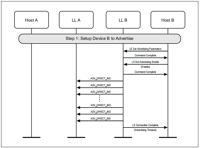 一个设备可以使用定向广告来允许一个发起者连接到它。高占空比定向广告在控制器中是有时间限制的,因此这可能会在创建连接之前失败。本示例只显示了故障的情况: