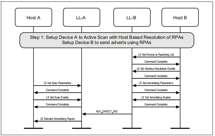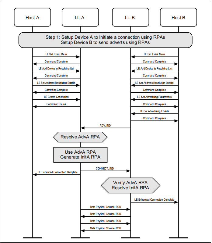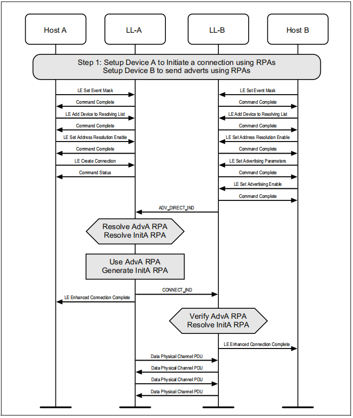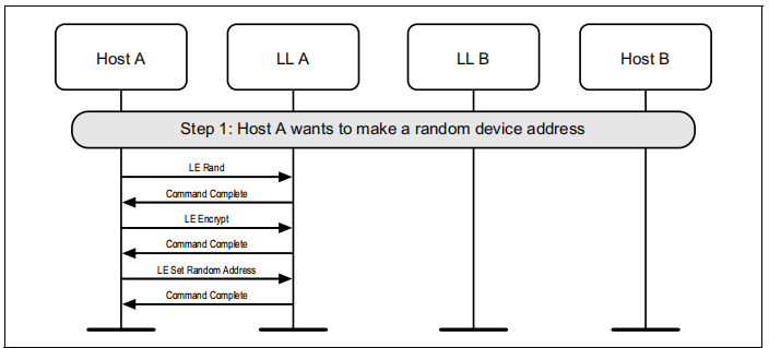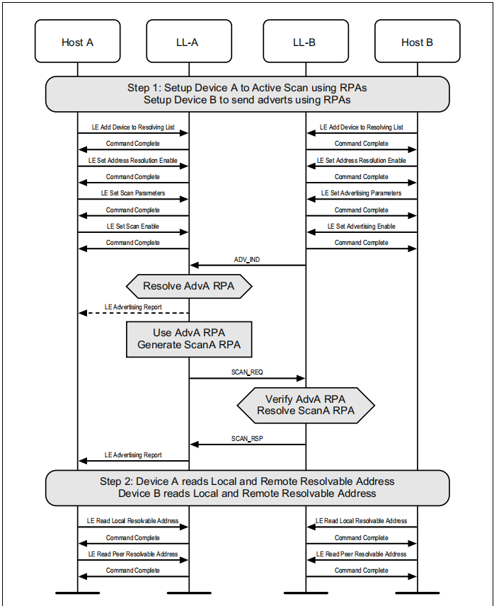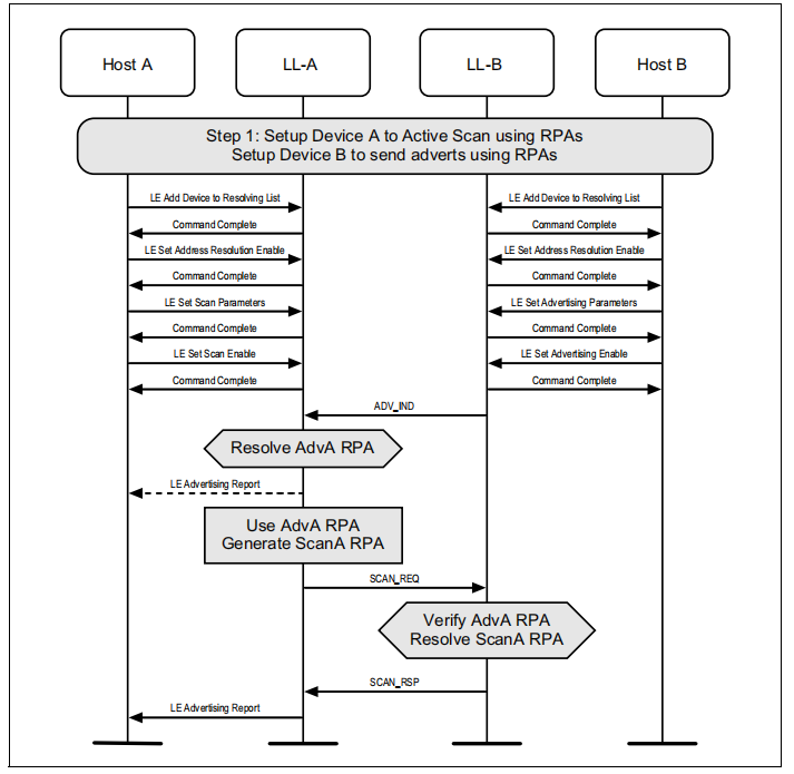 如果设备使用主动扫描和隐私广告,控制器将定期更新在两个设备上使用的可解析的私人地址。主机可以随时从控制器中读取当前正在使用的地址。