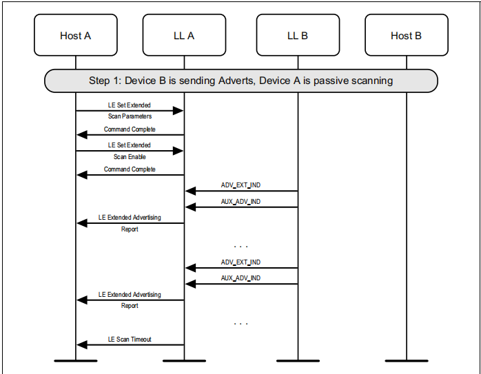 一个设备可以使用被动扫描来查找该区域内的广告设备。这将接收来自同行设备的广告数据包,并将其报告给主机: