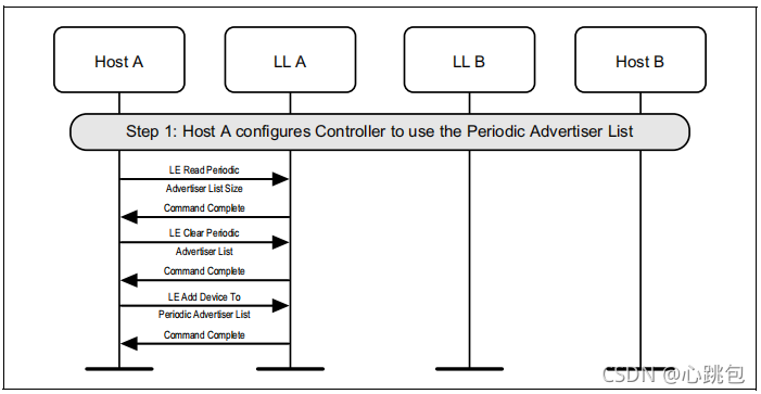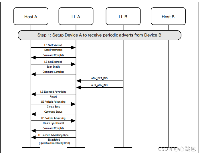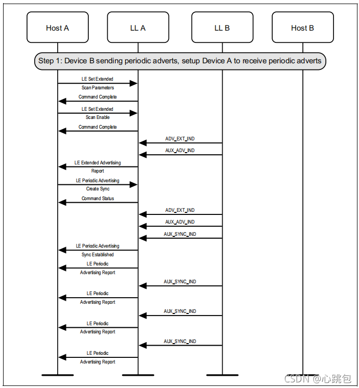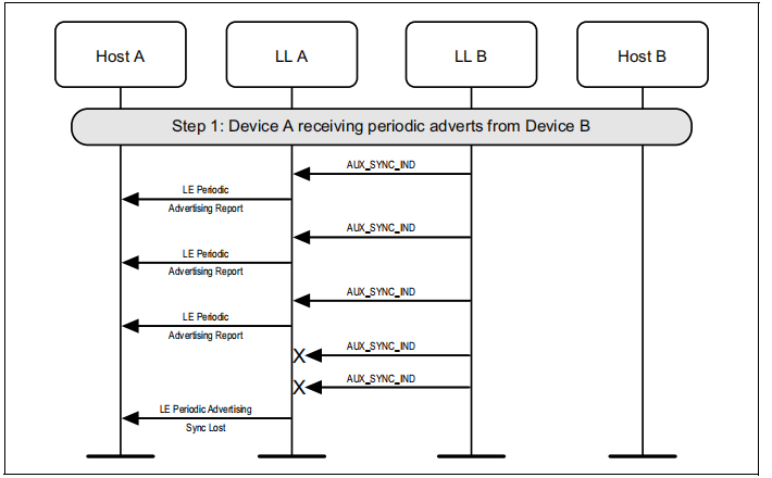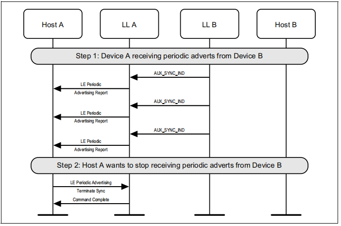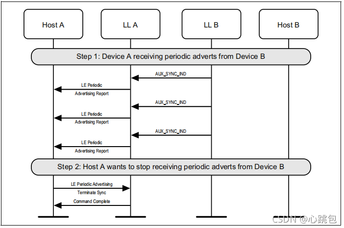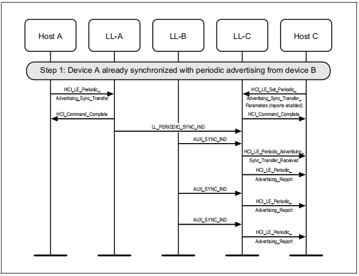 扫描设备(A)将定期广告同步信息传输到设备C,设备C开始收听定期广告传输,并立即向主机发送报告。