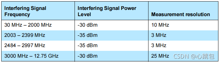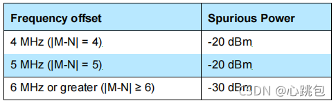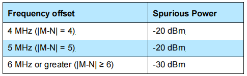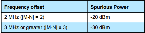 例外最多允许在三个1MHz宽度的频段内,以频率为1MHz的整数倍为中心。这些例外的绝对值为-20dBm。