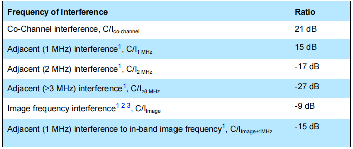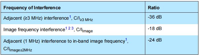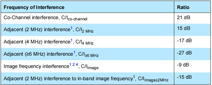 任何不满足要求的频率都被称为伪响应射频信道。1Msym/s调制接收的5个伪响应射频信道与期望信号的距离为≥为2MHz,2Msym/s调制接收的距离为≥为4MHz;两种调制方案允许不同的伪响应信道。这不包括具有1Msym/s和2Msym/s调制的图像频率,具有1Msym/s调制的图像频率±为1MHz,以及具有2Msym/s调制的图像频率±为2MHz。在这些伪响应射频信道上,1Msym/s和2Msym/s调制发射器均应满足松弛干扰要求C/I=-17dB。