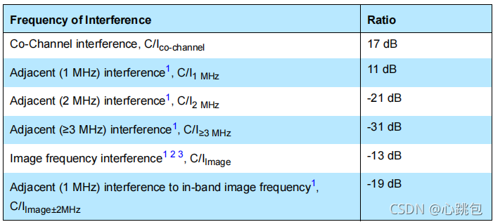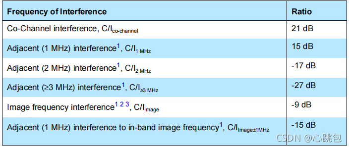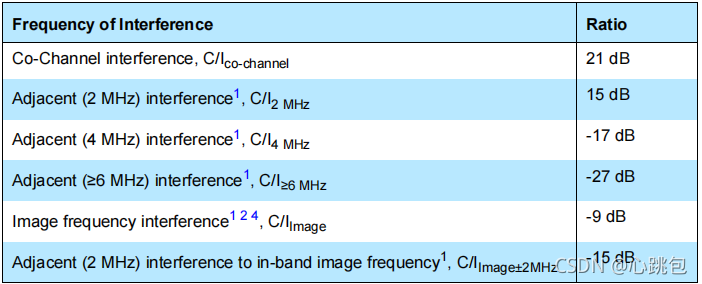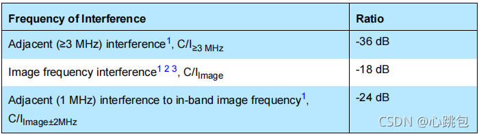 应通过参考灵敏度以上3dB的信号测量干扰性能。如果干扰信号的频率在频带2400-2483.5MHz之外,则应采用频带外屏蔽规范(见第4.3节)。所需信号和干扰信号均应为第4.6节中规定的参考信号。表4.3、表4.4、表4.5、表4.6中列出的所有信号干扰比的误码率应为≤0.1%: