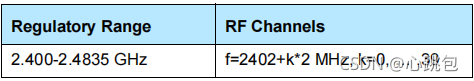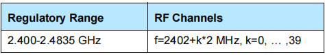 LE系统运行在2.4GHzISM波段,在2400-2483.5MHz。LE系统使用40个射频通道。这些射频信道的中心频率为2402+k*2MHz,其中k=0,...,39。