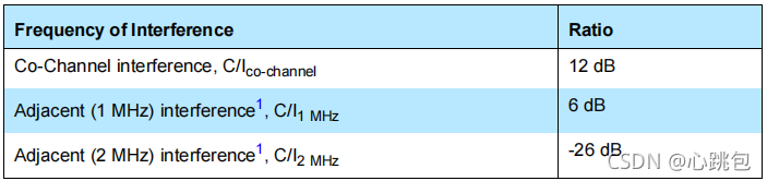 当使用1Msym/s调制(适用于LE 1M和LE编码PHYs)传输时,为从载波至少2MHz的信道,或者当使用2Msym/s调制传输时从载波至少4MHz时,指定相邻信道功率。该相邻信道功率定义为1MHz带宽下的测量功率之和。
