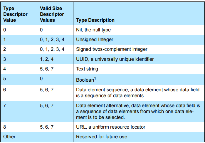 数据元素类型用5位类型描述符表示。类型描述符包含在数据元素头的第一个字节的最重要的(高阶)5位中。已经定义了以下类型。