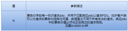 每个SDP PDU由一个PDU头和PDU特定的参数组成。标头包含三个字段:一个PDUID、一个事务处理ID和一个参数长度。这里描述了每个标题字段。参数可以包括延续状态参数,如下所述;每种PDU类型的PDU特定参数稍后将在单独的PDU描述中描述。