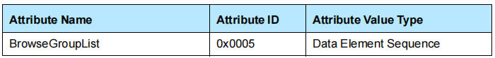 浏览组列表属性由一个数据元素序列组成,其中每个元素都是一个UUID,它表示服务记录所属的浏览组。顶级浏览组ID称为PuricBrowseRoot,表示浏览层次结构的根,来自分配数字的值为00001002-0000-1000-8000-00805F9B34FB(UUID16:0x1002)。