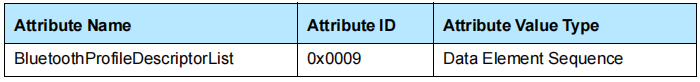 BluetoothProfileDescriptorList属性由一个数据元素序列组成,其中每个元素都是一个配置文件描述符,其中包含关于此服务记录所表示的服务符合的蓝牙配置文件的信息。每个配置文件描述符都是一个数据元素序列,其第一个元素是分配给该配置文件的UUID,其第二个元素是一个16位的配置文件版本号。