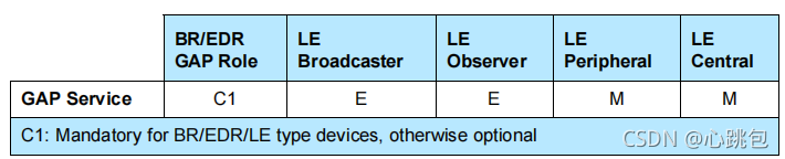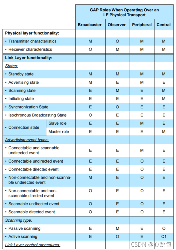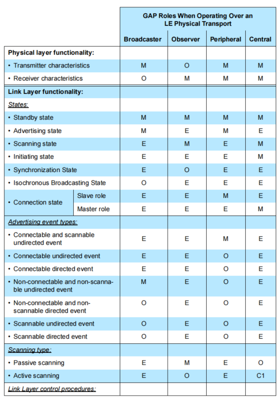 •中心设备定义在LE物理传输上操作时对每个GAP角色的物理层和链路层功能的遵从性要求。