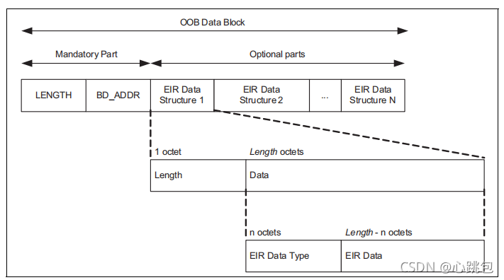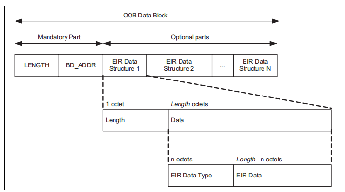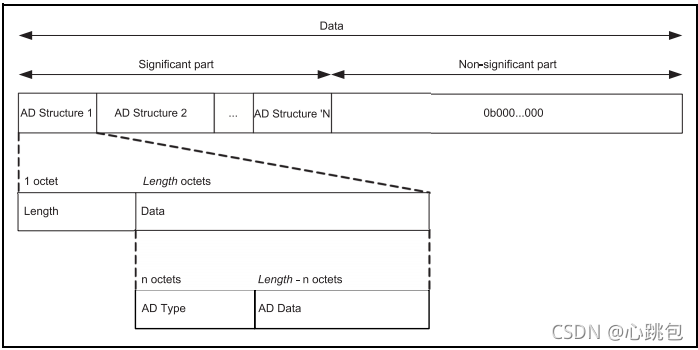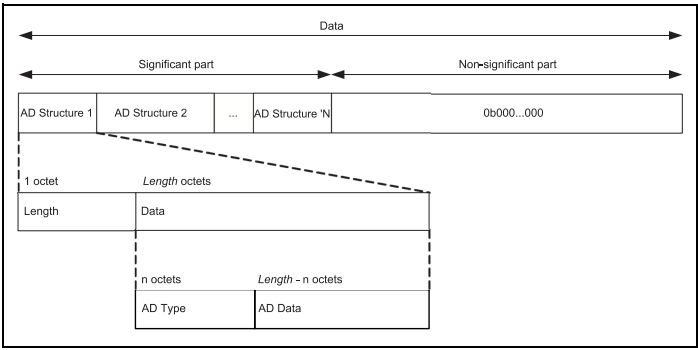 广播、定期广告和扫描响应数据的格式如图所示。这些数据由重要部分和不重要部分组成。最重要的部分包含了一系列的AD结构。每个AD结构应有一个八位的长度字段,其中包含长度值,和一个长度八位的数据字段。数据字段的第一个八进位字段包含AD类型字段。数据字段中其余的长度-1八进制的内容取决于AD类型字段的值,它被称为AD数据。