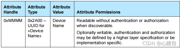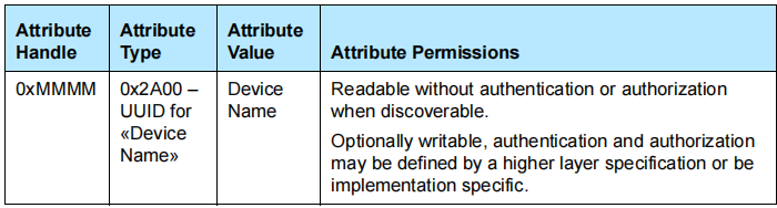 设备名称特性应包含UTF-8字符串。当设备被发现时,设备名称特征值应不经认证或授权即可可读。当设备无法发现时,如果没有身份验证或授权,设备名称不应可读特性。设备名称特征值可以可写入。如果可写,身份验证和授权可以由更高级的规范定义,或者特定于实现。