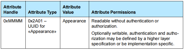 外观特征定义了设备外观的表示。这使得发现设备能够使用图标、字符串或类似的方式向用户表示该设备。外观特征值应未经身份验证或授权即可可读。外观特征值可能是可写入。如果可写,身份验证和授权可以由更高级的规范定义,或者特定于实现。