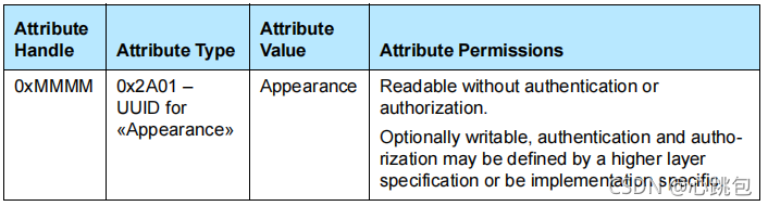 外观特征包含一个16位的数字,可以映射到描述设备发现过程中设备的物理表示的图标或字符串。它是位于设备的GATT服务器上的GAP服务的一个特征。