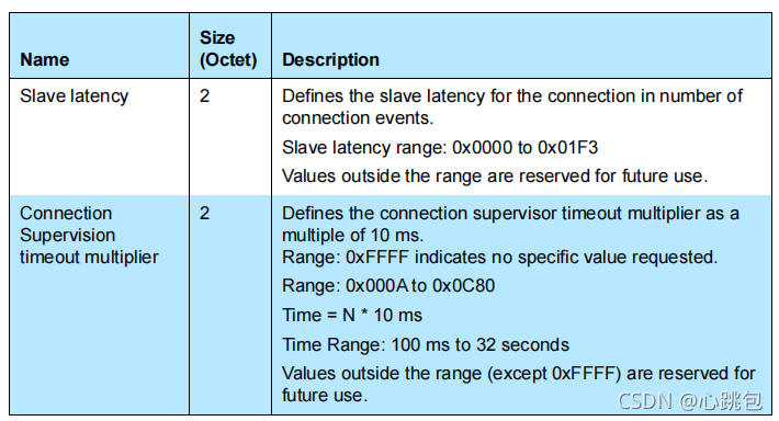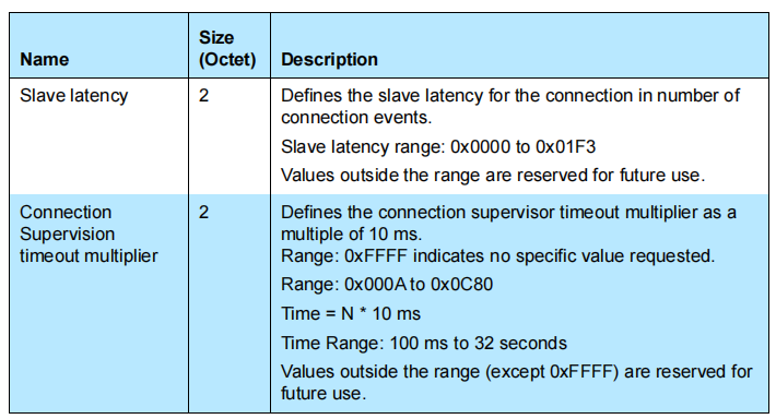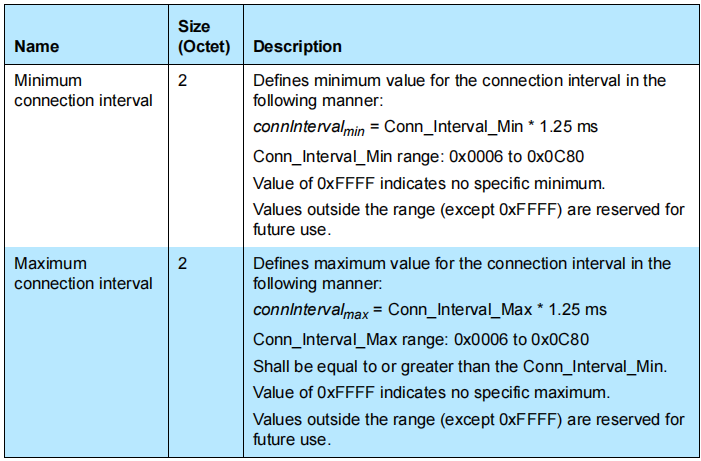 外围首选连接参数特征值的长度应为8位。一个设备应仅具有一个外围设备首选连接参数特性的实例。