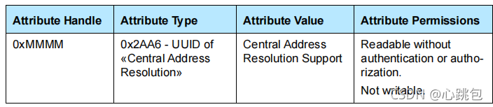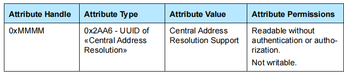 在使用将启动器地址设置为可解析的专用地址(RPA)的定向广告之前,外围设备应通过读取中心地址解析特征来检查地址对等设备是否支持地址解析。