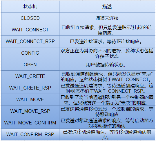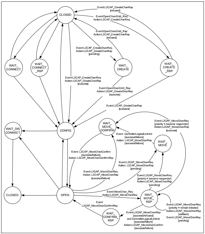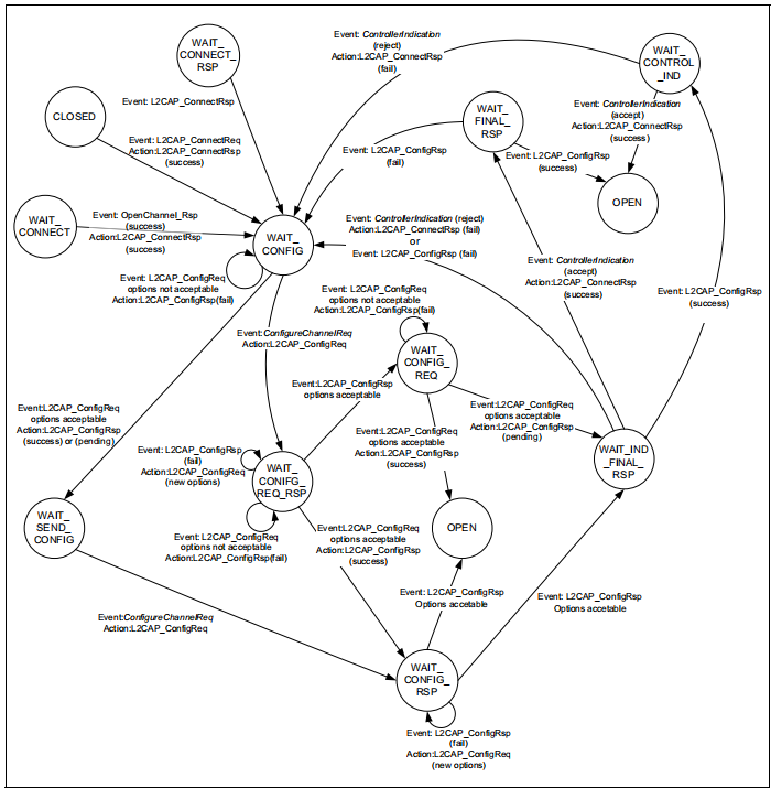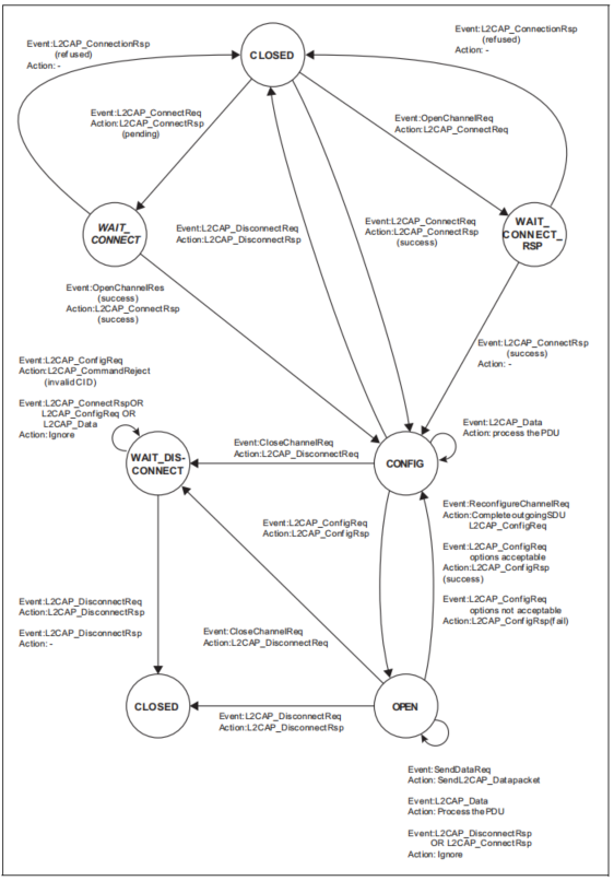 每个L2CAP面向连接的通道都有一个活动的状态机。将为接收到的每个新L2CAP_ConnectReq创建一个状态机。状态机始终在关闭状态下启动。