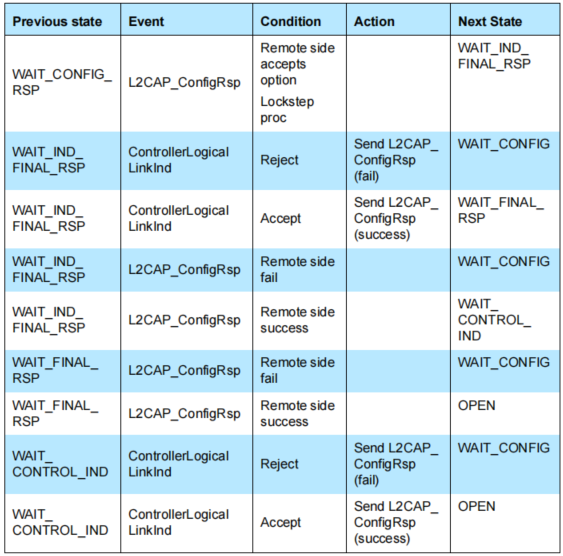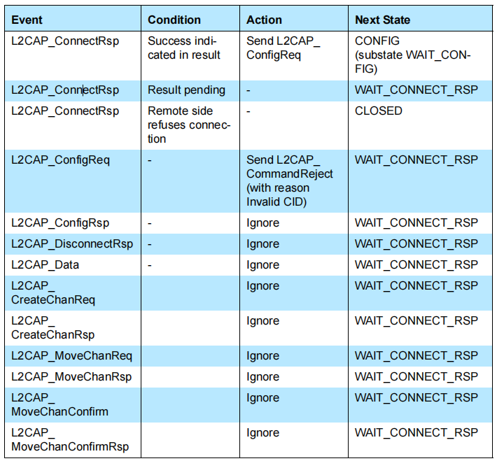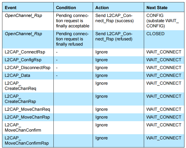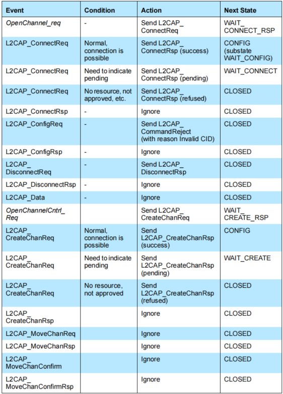 除了关闭状态之外,L2CAP_ConnectReq消息在任何其他状态中都没有被提到,因为它会触发新通道的建立,从而导致分支进入到状态机的新实例中。