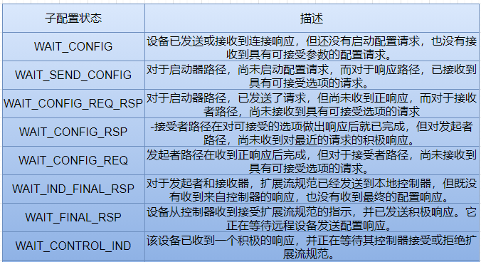 配置状态是通过来自关闭状态的WAIT_CONFIG子状态输入、WAIT_CONNECT状态或WAIT_CONNECT_RSP状态。如发起者和接受者路径都成功完成,则配置状态留为打开状态。
