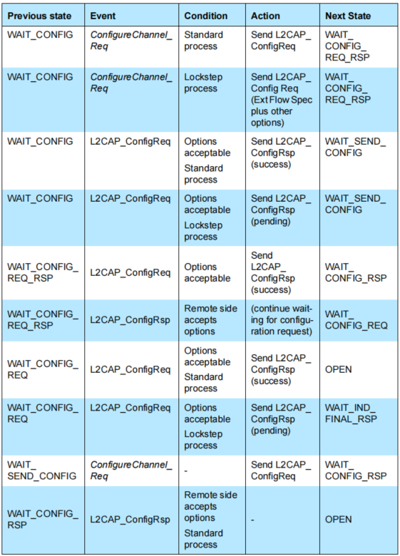 - 当L2CAP实体从远程设备接收到正L2CAP_CONFIGURATION_RSP时,它应考虑L2CAP_CONFIGURATION_REQ中显式包含的所有配置参数,以及远程设备所接受的L2CAP_CONFIGURATION_REQ中未显式包含的默认和先前同意的值