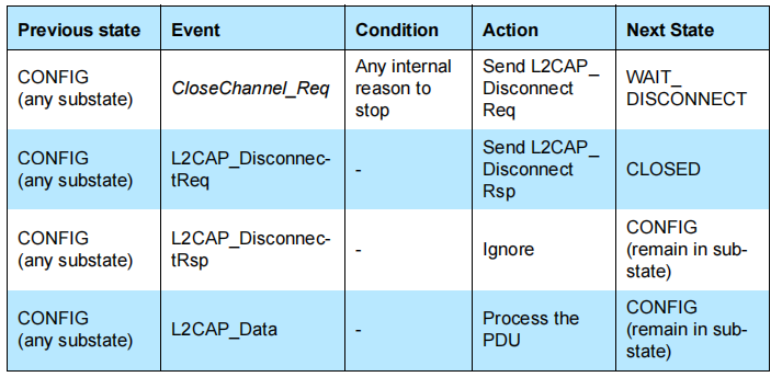 这里不包括L2CAP_DisconnectReq或L2CAP_ConfigReq消息,因为源和目标光盘还不可用,无法将其与特定通道的状态机正确联系起来。