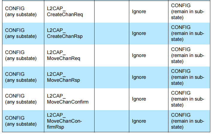 这里不包括L2CAP_DisconnectReq消息,因为源和目标L2CAP_DisconnectReq还不可用,无法将其正确地与特定通道的状态机联系起来。