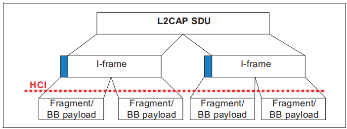 在流式控制、流媒体或再传输模式中,传入的SDU可以被分解为分段,然后用L2CAP协议元素(标题和校验和字段)单独封装以形成I帧。I帧受流量控制,并可能受重传程序。报头携带一个2位SAR字段,用于识别i帧是“开始”、“结束”还是“继续”数据包,或者它是否携带一个完整的、未分割的SDU。