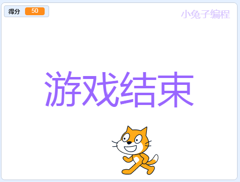 当得分等于50分,小猫隐身,出现“游戏结束”四个字,游戏结束
