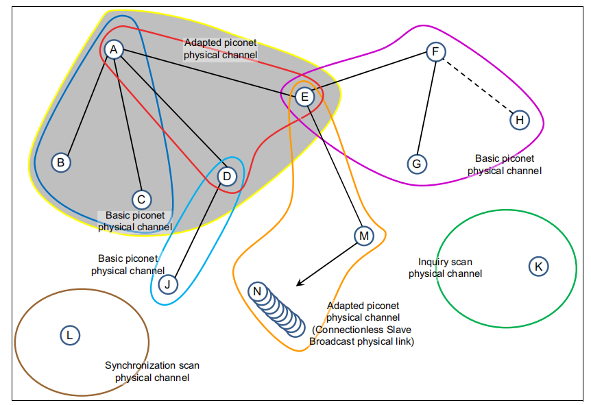 PiconetD和PiconetF都只使用一个基本的Piconet物理通道(分别由青色和洋红色的外壳表示)。在微网D的情况下,这是因为设备J不支持自适应跳变模式。虽然设备D支持自适应跳变,但它不能在这个图片中使用它。在皮内F中,F不支持自适应跳变,因此不能在这个皮内F中使用。
