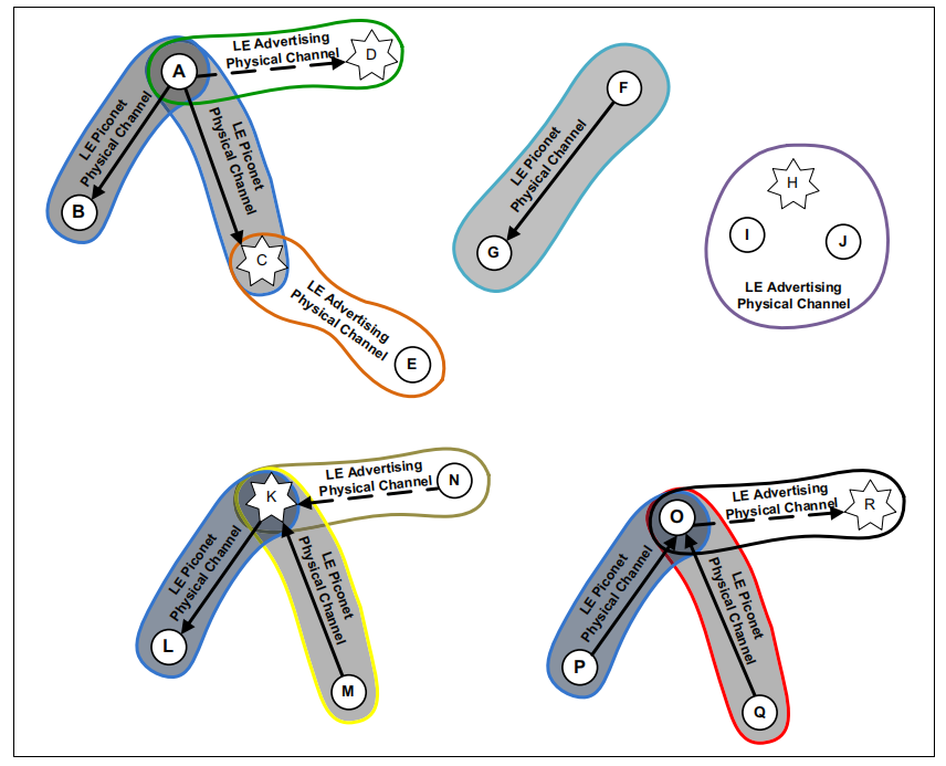 在散点网O中,设备O和P使用一个LE微网物理通道。设备O和Q正在使用另一个LE微型网络物理通道。在组R中,设备R使用广播物理通道上的可连接的广播事件进行广播,而设备O是发起器。设备O可以形成一个与设备R的连接,导致设备O同时成为两个设备的从设备和一个设备的主设备。