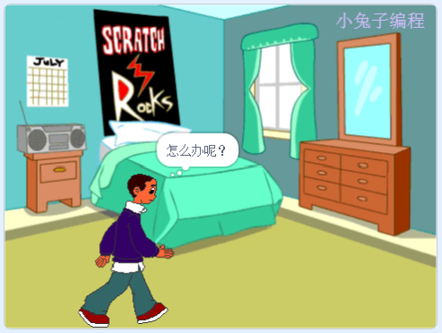 当播放完所有声音后,Jaime从舞台左侧走到右侧,再从右侧走到左侧,边走边思考“怎么办?”(注意走的过程中脚不能朝上,并且朝哪个方向走Jaime就面朝哪里)