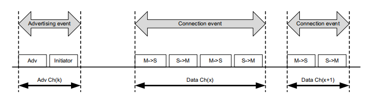 物理通道细分为时间单位,称为事件。数据是在这些事件中定位的数据包中的LE设备之间传输。存在以下类型的事件:广播、扩展广播、周期广播、连接和同步事件。