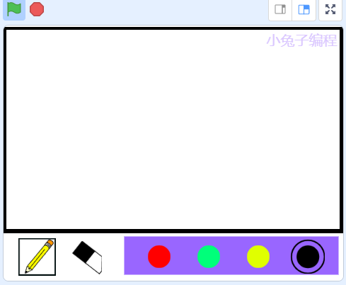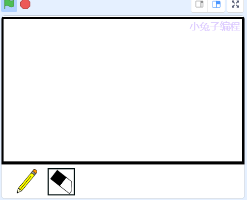 1.点击绿旗,舞台上出现要求的角色与背景,默认选择橡皮;