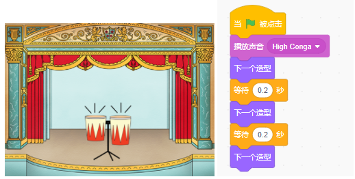 考点分析:考查积木综合使用,重点考查播放声音积木的使用,播放声音积木是播放声音的同时执行后面的积木,播放声