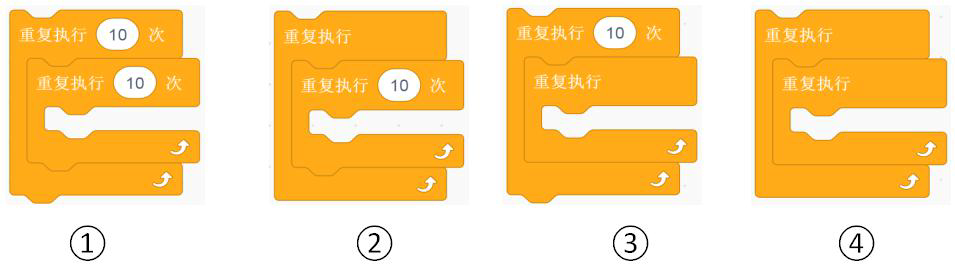 考点分析:考查循环积木的使用,重点考查嵌套循环;嵌套循环一般遵循的规则是:无限循环可以嵌套有限循环,有限循环可以嵌套有限循环;也就是①和②,所以答案A③④是错的。