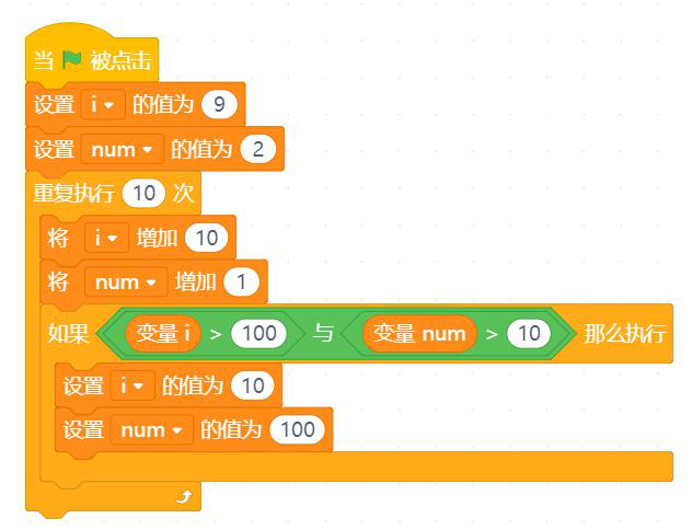 考点分析:考查积木的综合使用,重点考查变量、逻辑与运算和循环积木的使用;开始的时候i=9,num=2,重复执行10次里面是每次i+10,num+1;