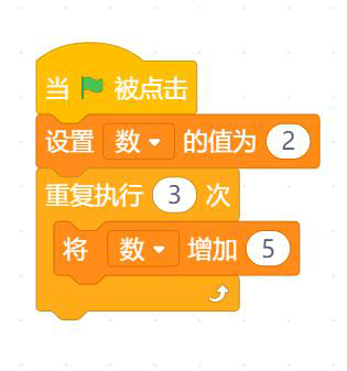 考点分析:考查积木的综合使用,重点考查变量和循环积木的使用;开始之前数=2,重复3次,每次数增加5,3次后也就是增加了3*5=15;所以数=2+15=17,答案C