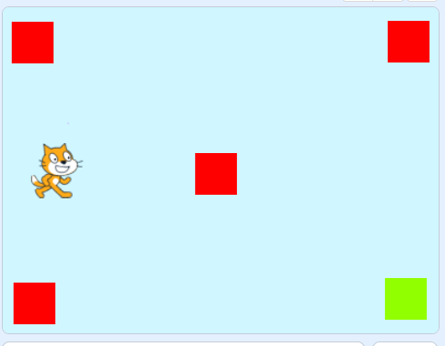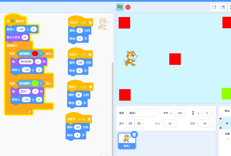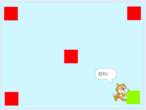 (4)当小猫碰到绿色时胜利,喊出”胜利!“,并回到初始位置。