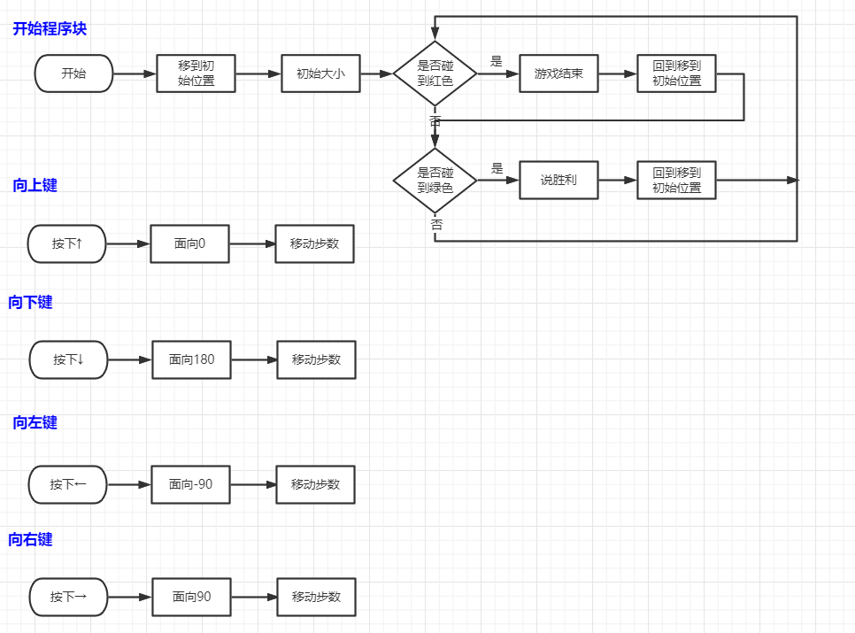 功能实现有键盘控制操作,而在Scratch中通过键盘实现控制角色的运动有多种方式,我们这里采用事件的方式;所以我们整个小猫角色的程序将会有5个程序段,具体流程如下: