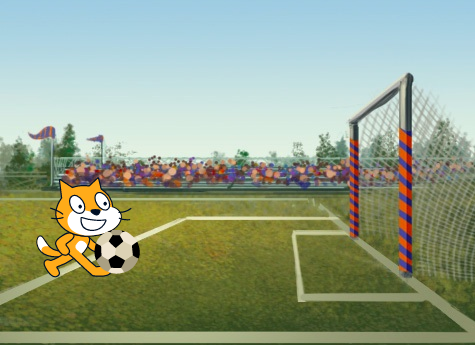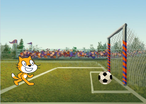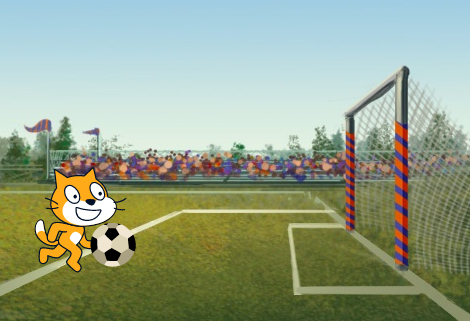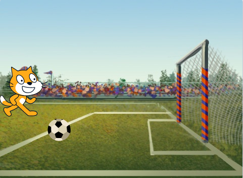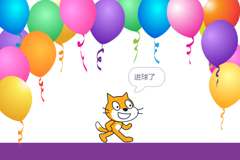 足球缓慢飞入球门,进球后,背景切换为party,小猫说进球了2秒,程序结束