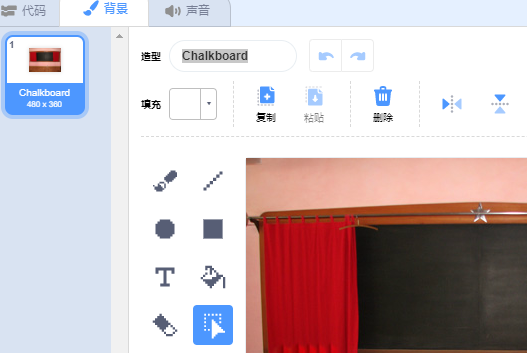 从背景库中添加Chalkboard背景到舞台中,并删除空白背景,如下图所示: