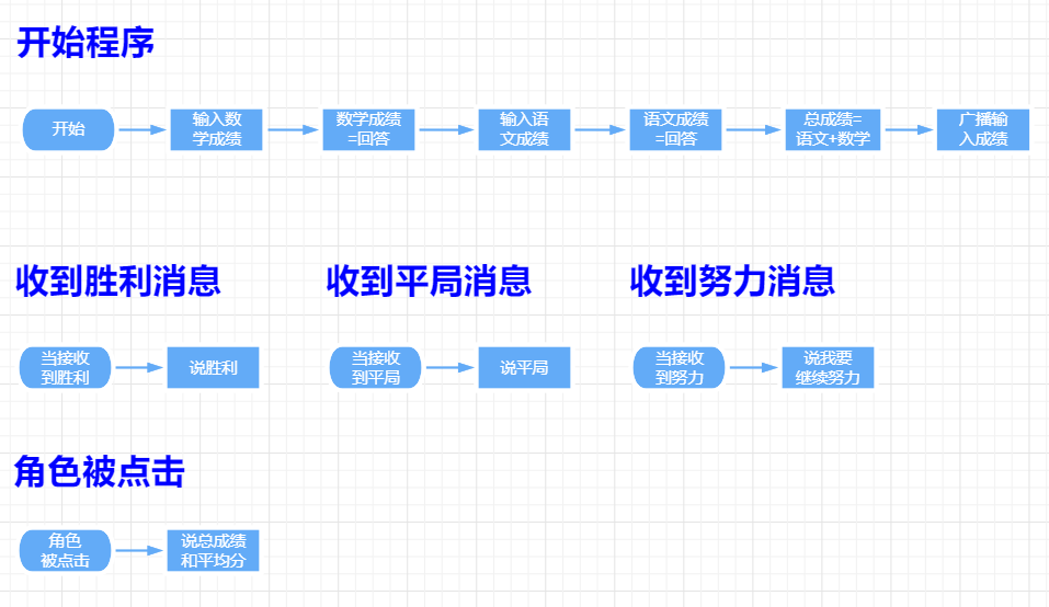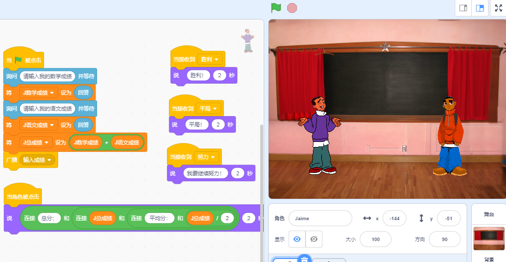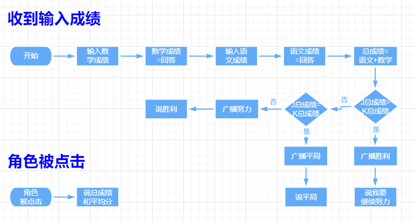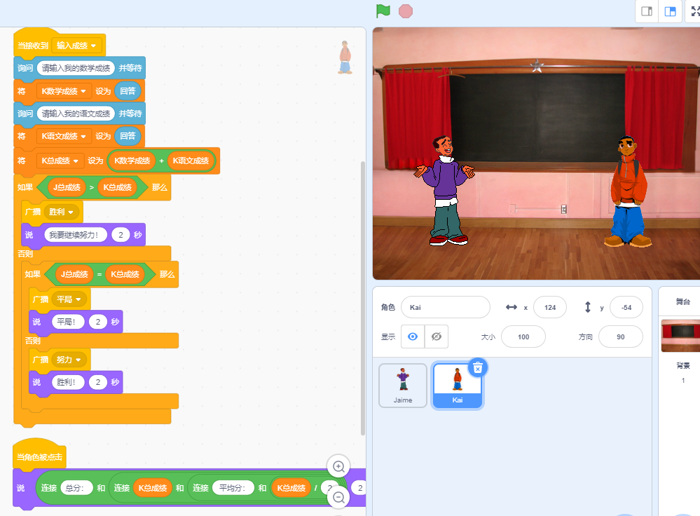 Kai是收到输入成绩,然后才开始从键盘输入对应的数学语文成绩、输入完之后进行判断;是J的总成绩大于K的总成绩就广播胜利消息,同时自己说我要继续努力2秒;否则判断他们成绩是否相等,如果相等就广播平局消息,同时自己说平局2秒;否则广播努力消息,同时自己说胜利2秒;最后角色被点击的时候就说出自己的总成绩和平均分;具体分析如下: