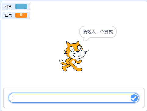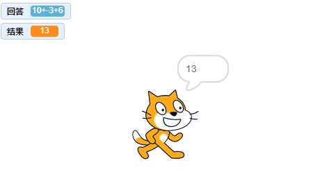 点击绿旗以后,输入任意加减混合运算算式,小猫会说出正确的运算结果