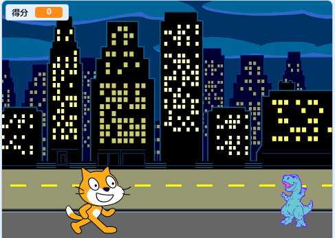 程序运行后,恐龙自右向左移动,当碰到舞台边缘时,游戏得分增加1,同时角色回到初始位置