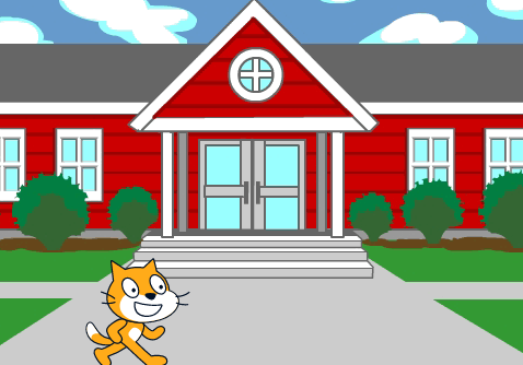 点击绿旗,等待1秒后,小猫面向学校,走到学校门口,切换背景Soccer2;