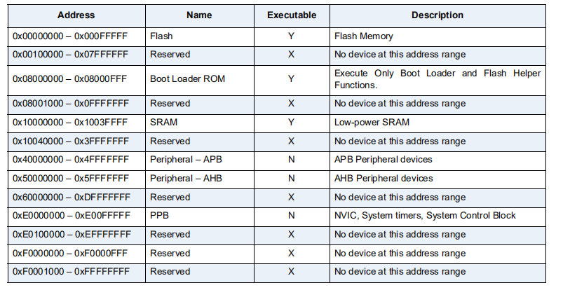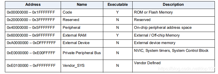ARM为基于ARM v7-M架构的设备提供了定义良好的内存映射。M4进一步细化了外围设备和系统地址范围的地图。下面是ARM定义的系统内存映射