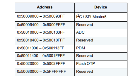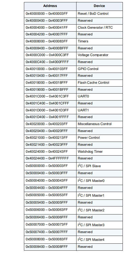内存映射中的外围设备在4 KB的边界上分配,允许每个设备最多1024个32位控制和状态寄存器。当试图访问不存在的寄存器时,外设将返回未定义的读数据。外设,无论是通过APB还是AHB访问,都将始终接受发送到其寄存器的任何写数据,而不会尝试返回错误响应。具体地说,对只读寄存器的写操作将变成无关紧要的写操作。