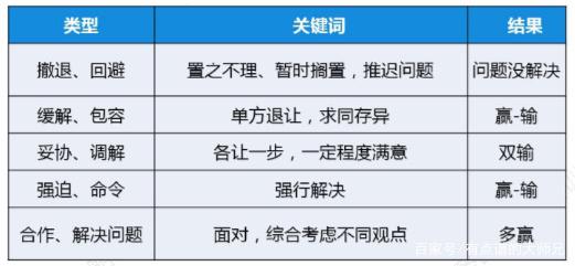 3、题目中暗示了不用正面解决,比如出现:立即、降低紧张气氛、部分满意等关键词,则按照相关的冲突处理策略的特征选。