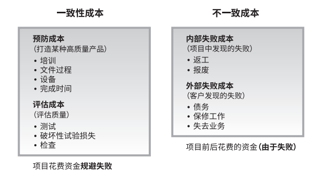解析:一致性成本包括预防成本(如培训、文件过程、设备、完成时间等)以及评估成本(测试、破坏性试验损失、检查等)。