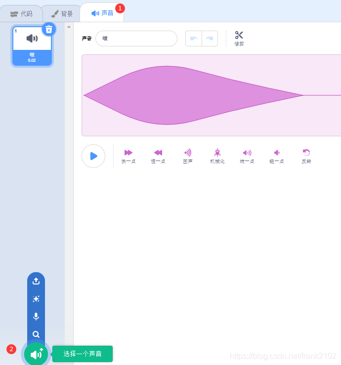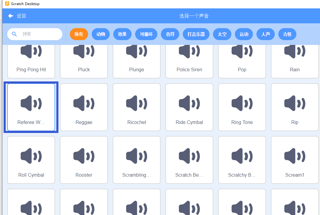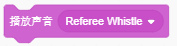 - 背景添加好了之后我们还需要添加一个声音音效,来模拟实现裁判员吹口哨的声音。操作方法:点击背景的声音标签,点击左下角从声音库中选择一个音效,我这边选的音效是(Referee Whistle),如下图所示